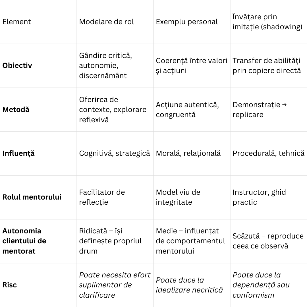 În mentoratul profesional, modelarea de rol nu înseamnă „a fi un model de urmat” în sens aspirațional, ci a crea un spațiu de învățare în care clientul de mentorat este expus la moduri variate de gândire, luare a deciziilor și raportare la situații complexe. Mentorul nu oferă „soluții gata făcute”, ci perspective și contexte din care clientul de mentorat își extrage propriul sens.